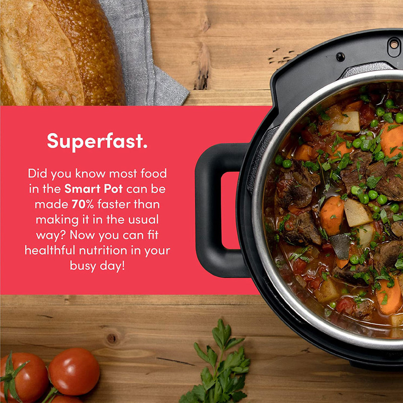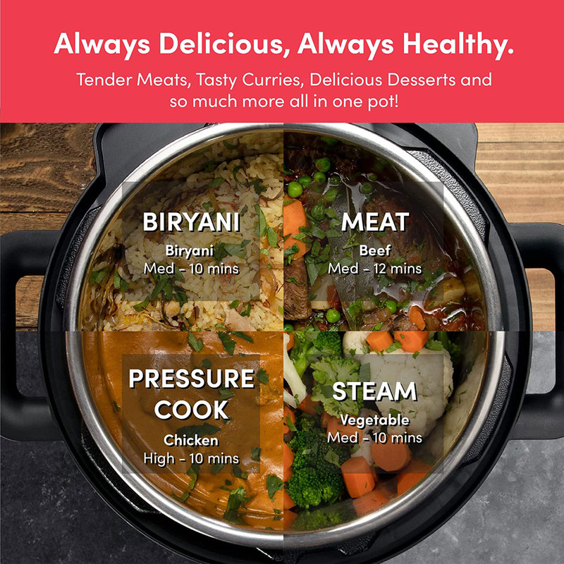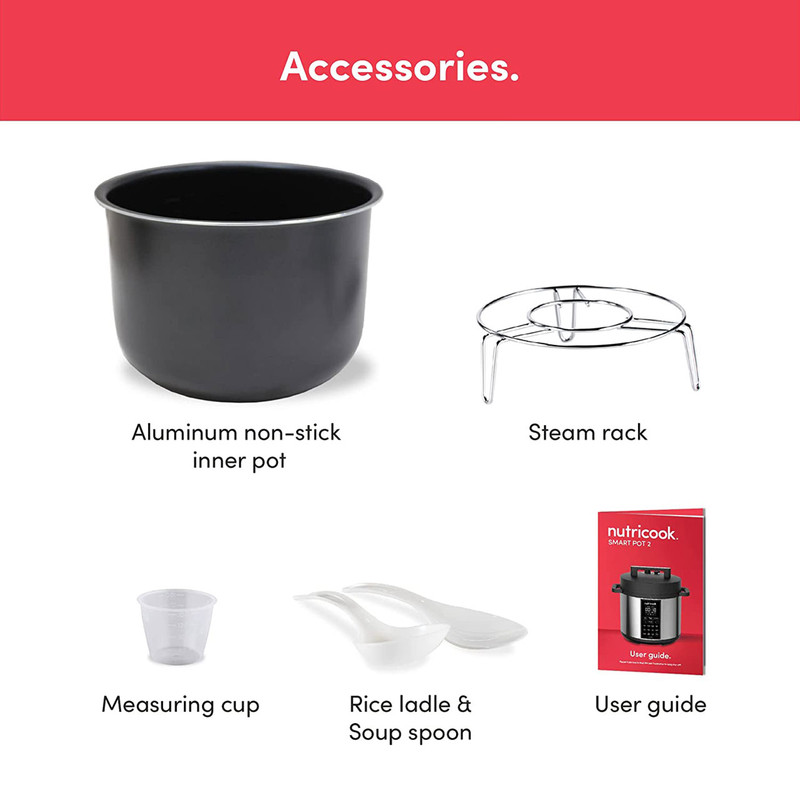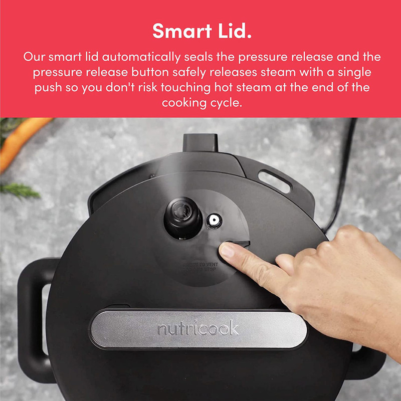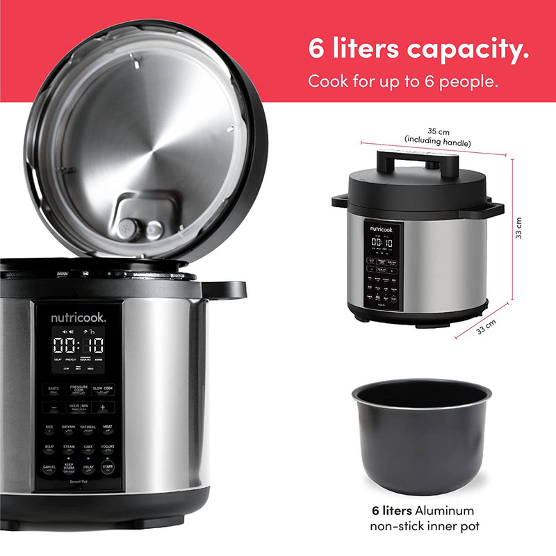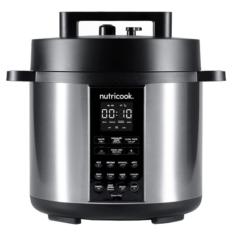 | سایر توضیحات | برنامه ها ( pressure cooker, sauté pot, slow cooker, rice cooker, steamer, sous vide pot, soup maker, yogurt maker, and food warmer ) ( زودپز ، تفت دهی یا سرخ کردن ، آرام پز ، پلوپز ، بخارپز ، کیسهپزی ، سوپ ساز ، ماست ساز و گرم نگهدارنده غذا ) / دستگاه طراحی و مهندسی نوتریبولت در کالیفرنیا اسمبل در چین / Superfast زودپز هوشمند نوتریکوک 70% درصد سریعتر از تهیه آن به روش معمول تهیه می شوند / دارای فناوری Smart Lid درب هوشمند / دارای قابلیت DELAY شروع با تاخیر / قابلمه پخت و پز داخلی نوتریکوک SP208A از آلومینیوم فشرده با روکش نچسب عاری از PFOS و PFOA ساخته شده است که سلامت و کیفیت غذا را تضمین می کند |