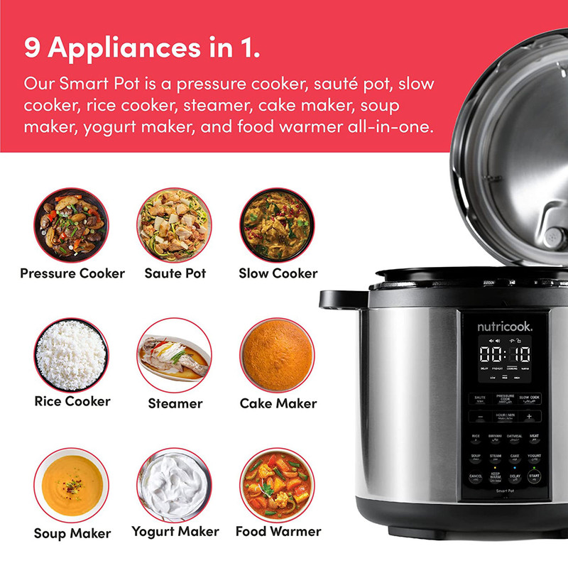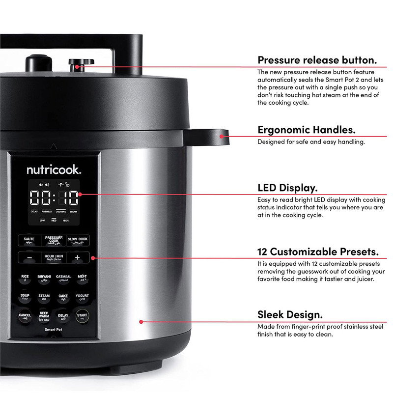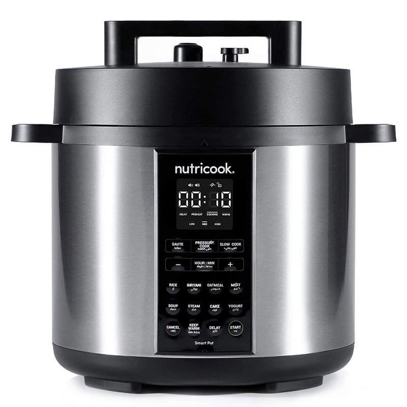 | سایر توضیحات | برنامه ها ( pressure cooker, sauté pot, slow cooker, rice cooker, steamer, sous vide pot, soup maker, yogurt maker, and food warmer ) ( زودپز ، تفت دهی یا سرخ کردن ، آرام پز ، پلوپز ، بخارپز ، کیسهپزی ، سوپ ساز ، ماست ساز و گرم نگهدارنده غذا ) / دستگاه طراحی و مهندسی نوتریبولت در کالیفرنیا اسمبل در چین / Superfast زودپز هوشمند نوتریکوک 70% درصد سریعتر از تهیه آن به روش معمول تهیه می شوند / دارای فناوری Smart Lid درب هوشمند / دارای قابلیت DELAY شروع با تاخیر / قابلمه پخت و پز داخلی نوتریکوک SP208A از آلومینیوم فشرده با روکش نچسب عاری از PFOS و PFOA ساخته شده است که سلامت و کیفیت غذا را تضمین می کند |